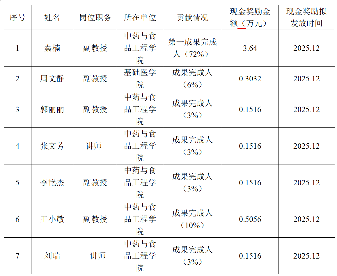 根据《财政部 税务总局 科技部关于科技人员取得职务科技成果转化现金奖励有关个人所得税政策的通知》(财税〔2018〕58号)、《科技部 财政部 税务总局关于科技人员取得职务科技成果转化现金奖励信息公示办法的通知》(国科发政〔2018〕103号)、《山西中医药大学促进科技成果转移转化实施方案的通知》(山中医科〔2020〕6号)及《山西中医药大学科技成果转化管理办法》(山中医校科〔2025〕3号)有关规定,现对我校“党参基质奶茶及炖煮水产品配方参数及工艺技术”的职务科技成果转化现金奖励相关信息公示如下: